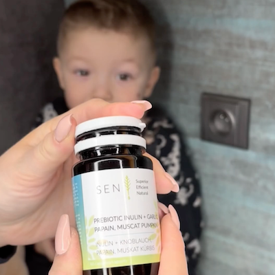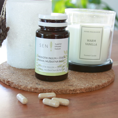 Kapsule, ki vsebujejo popolnoma naravne sestavine: prebiotik inulin (pridobljen iz cirkorije), česen, papain (aktivna sestavina papaje) in semena muškatne buče.