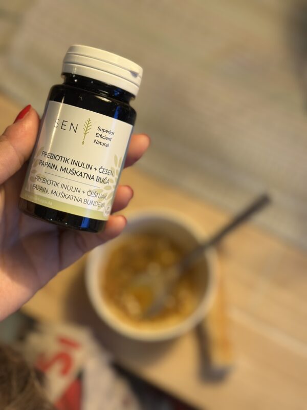 Inulin (prebiotik) – 360 mg: naravna vlaknina, ki služi kot hrana koristnim bakterijam v črevesju in pomaga ohranjati prebavni sistem v ravnovesju.